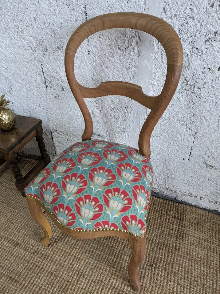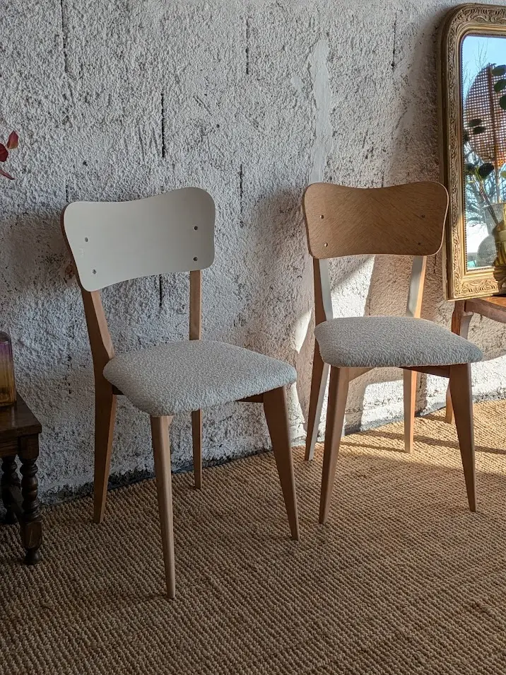 Ces chaises scandinaves au design épuré ont bénéficié d’une réfection complète des assises. J’ai remplacé l’ancien tissu par une bouclette douce et tendance, qui apporte confort et modernité tout en respectant l’esprit minimaliste du style nordique.