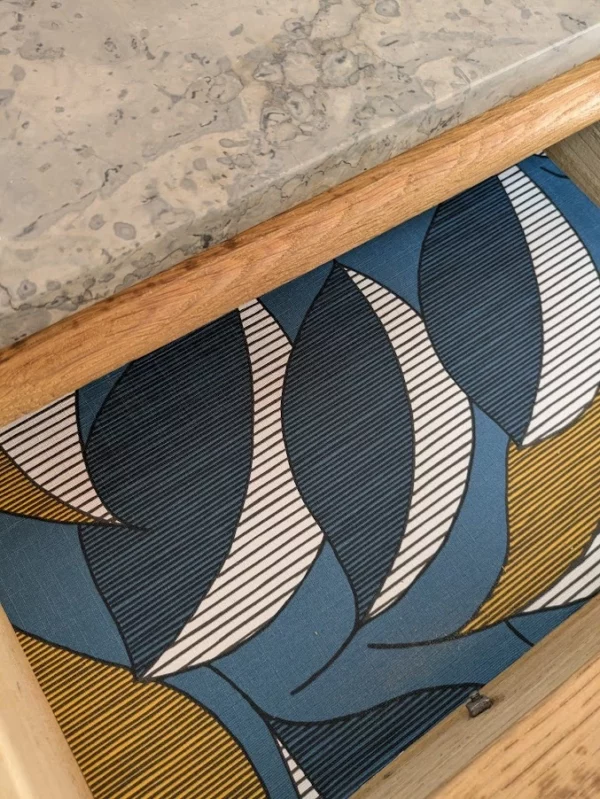 Cette table de chevet a été entièrement aérogommée.  Elle a été habillé avec un vernis en chêne clair pour garder toute sa simplicité et mettre en valeur le magnifique bois dont elle est faite.  Le Meuble est décoré d’un papier peint aux motifs ethniques pour plus de modernité.